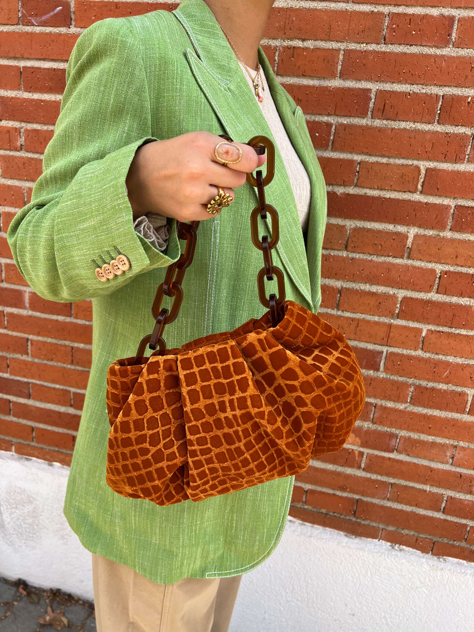 Hecho a mano con un tejido suave y agradable al tacto. Un bolso fabricado con mucho cariño: terciopelo con estampado coco en un color alegre y original y forro de vichy de algodón orgánico. Cuenta con un bolso interior.